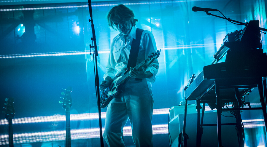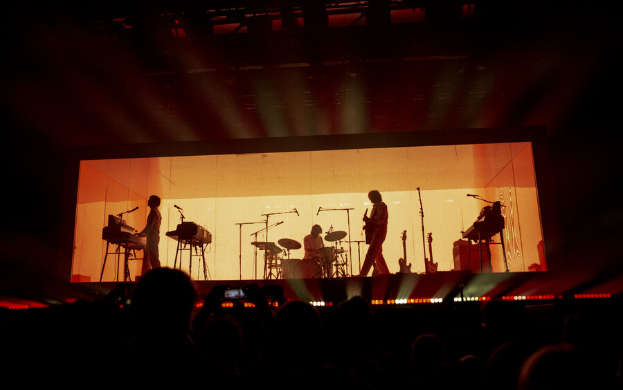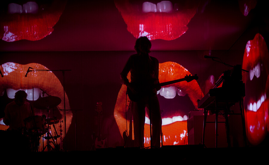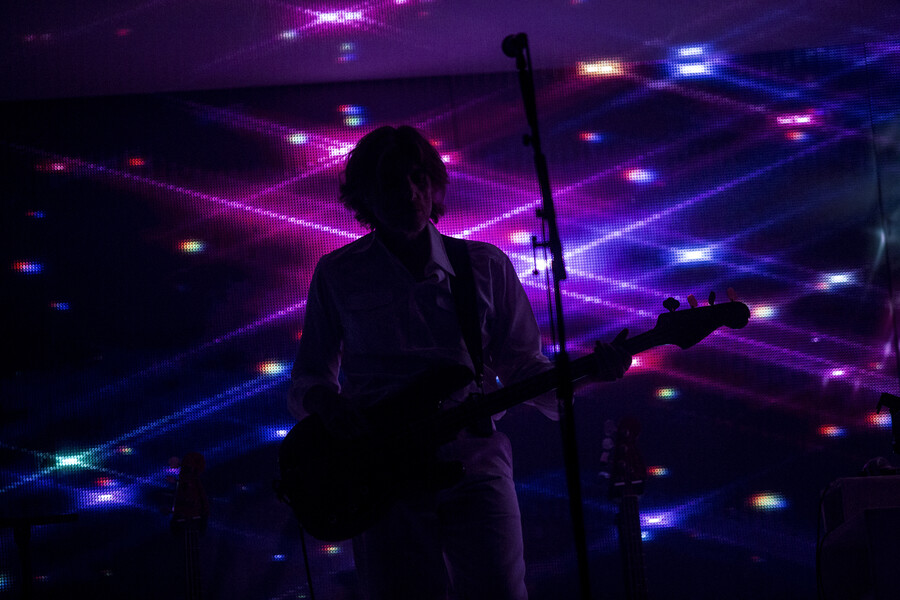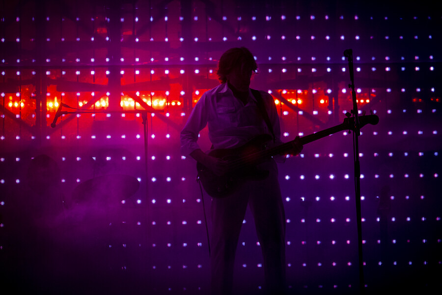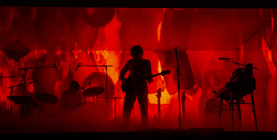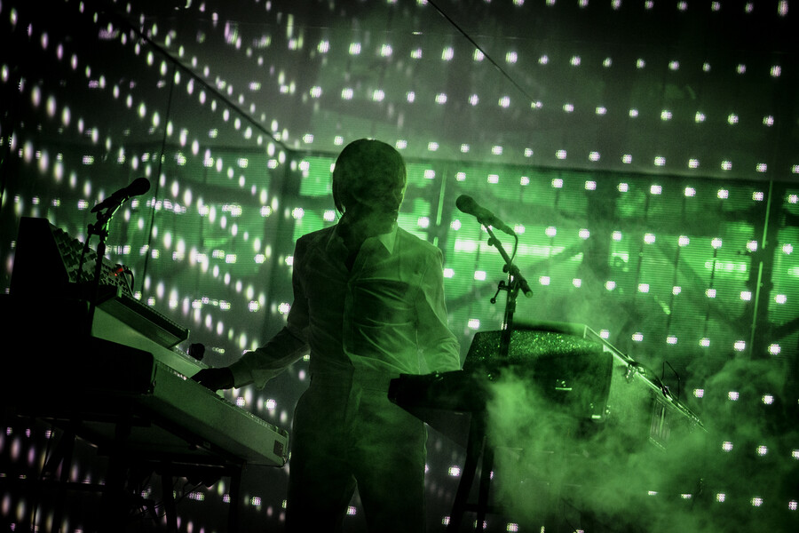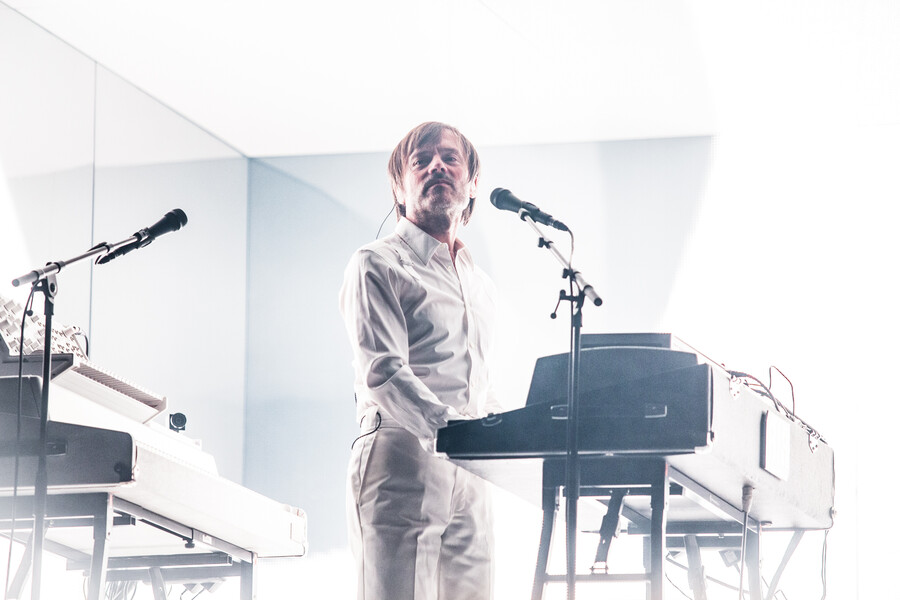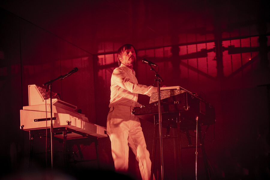 The stage design was deliberately minimalist. The iconic White Box, an almost completely enclosed space with mirrored walls, dominated the venue. Synthesiser stacks flanked both sides, with guitars for Nicolas Godin and a modest drum kit for drummer Louis Delorme positioned at the rear. When the three musicians took the stage in white outfits, crisp white lighting bathed the entire scene in a purist atmosphere.